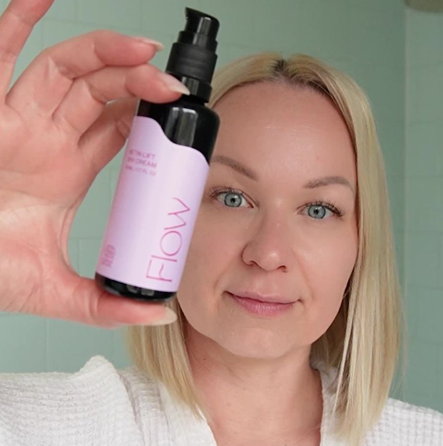 "Aloitin käyttämään Flow Cosmeticsin Retin Lift-voidetta, ja nyt noin kolme viikkoa tuotteita käyttäneenä iho on selvästi kimmoisampi, kosteutetumpi, kirkkaampi ja kuulaampi."