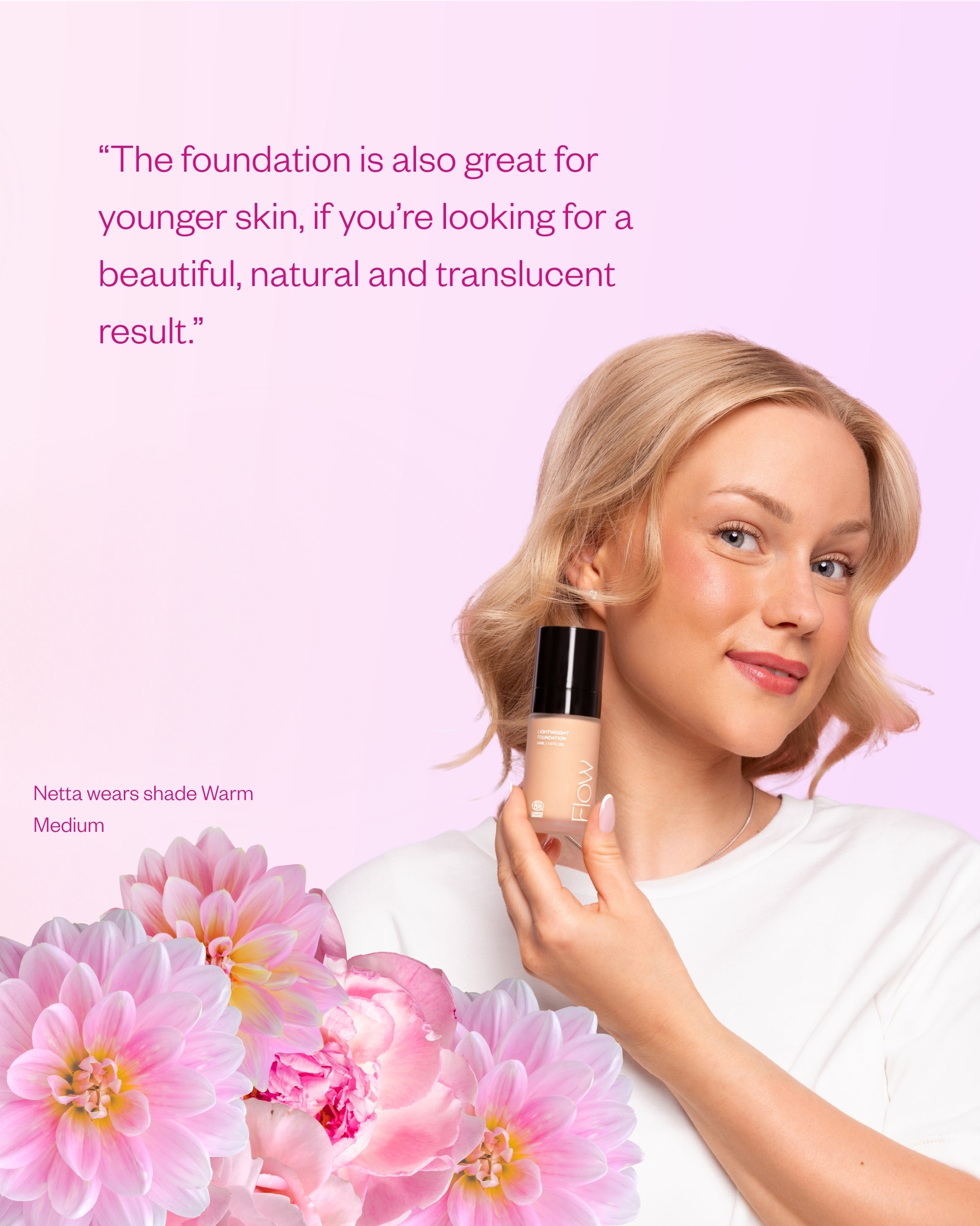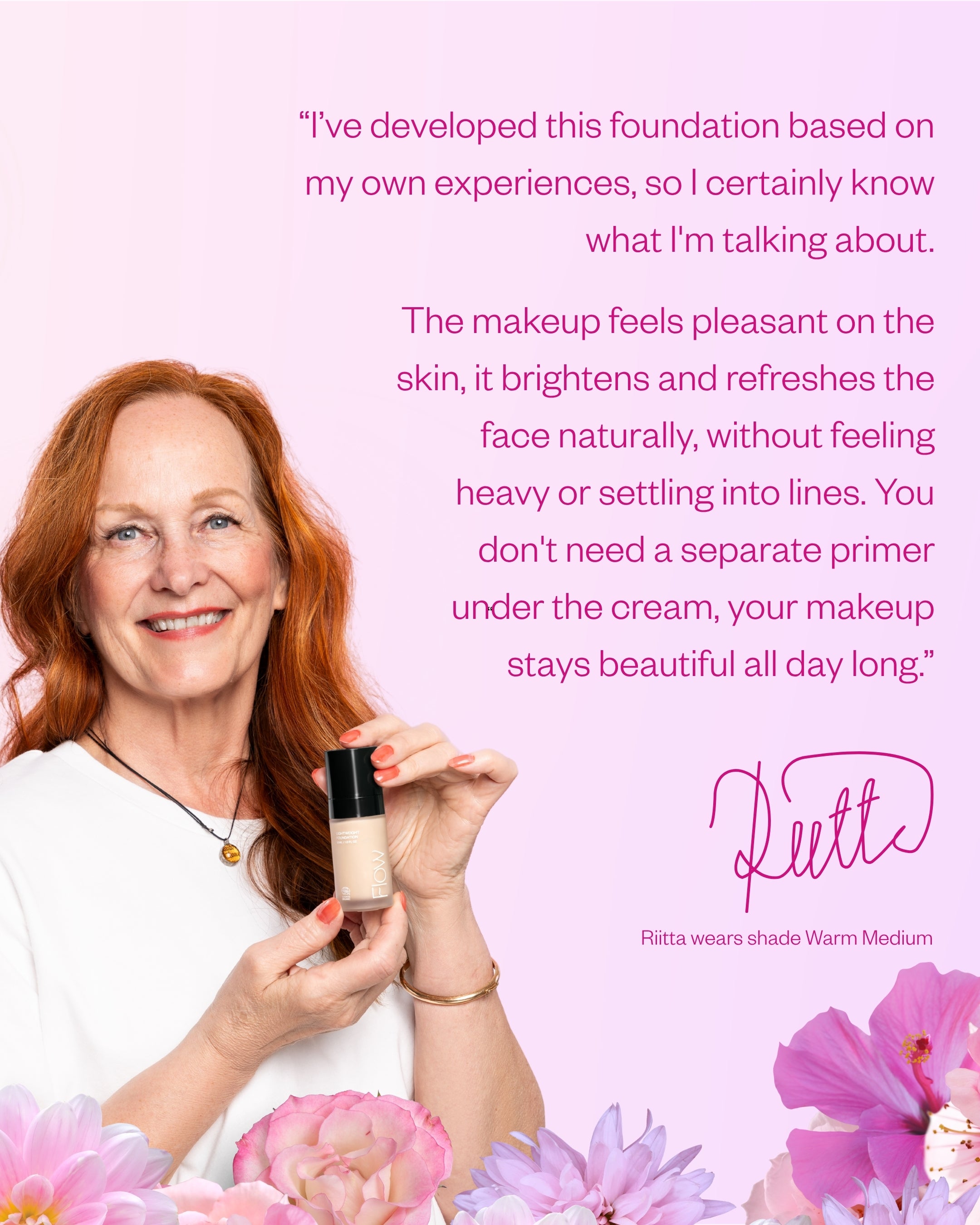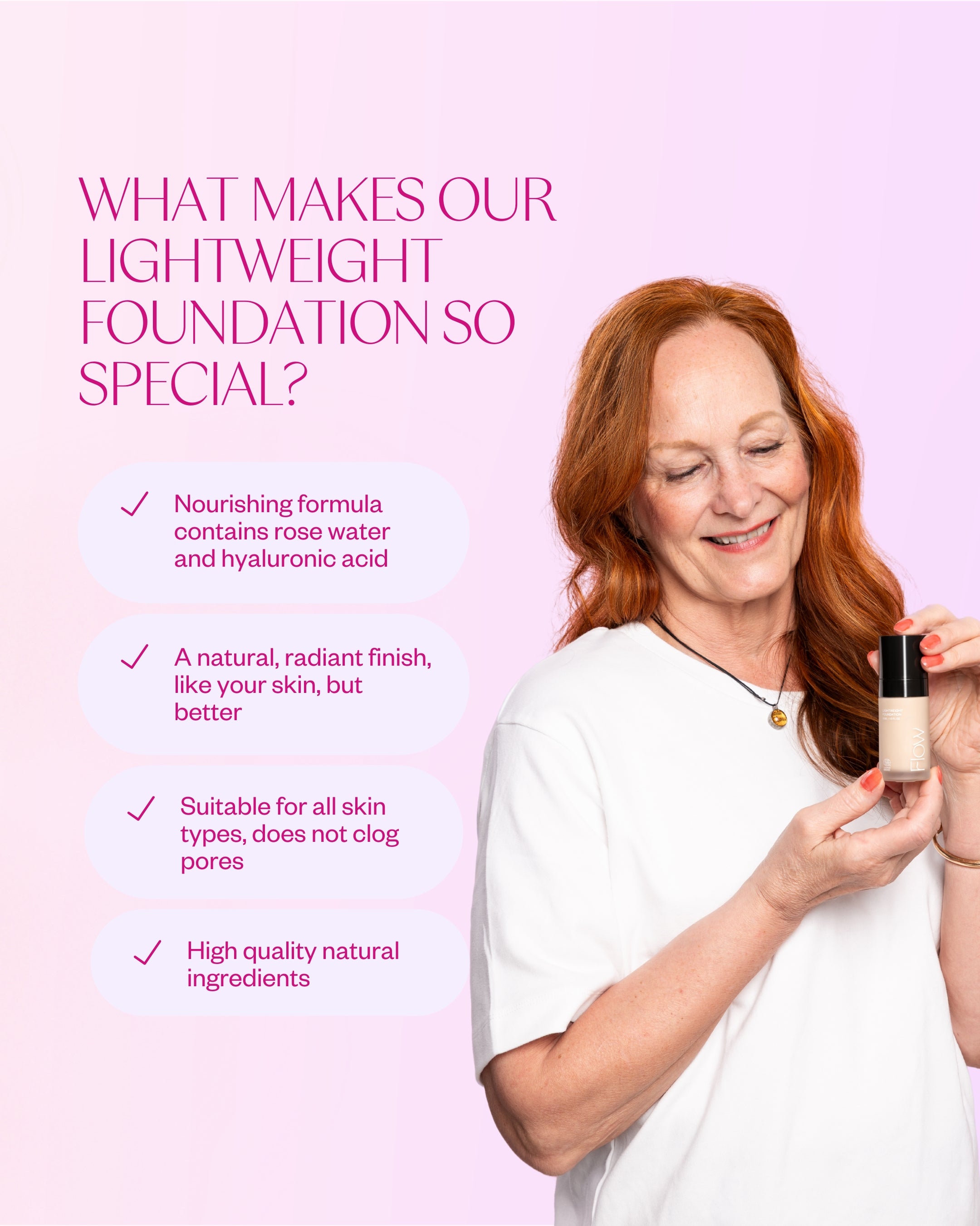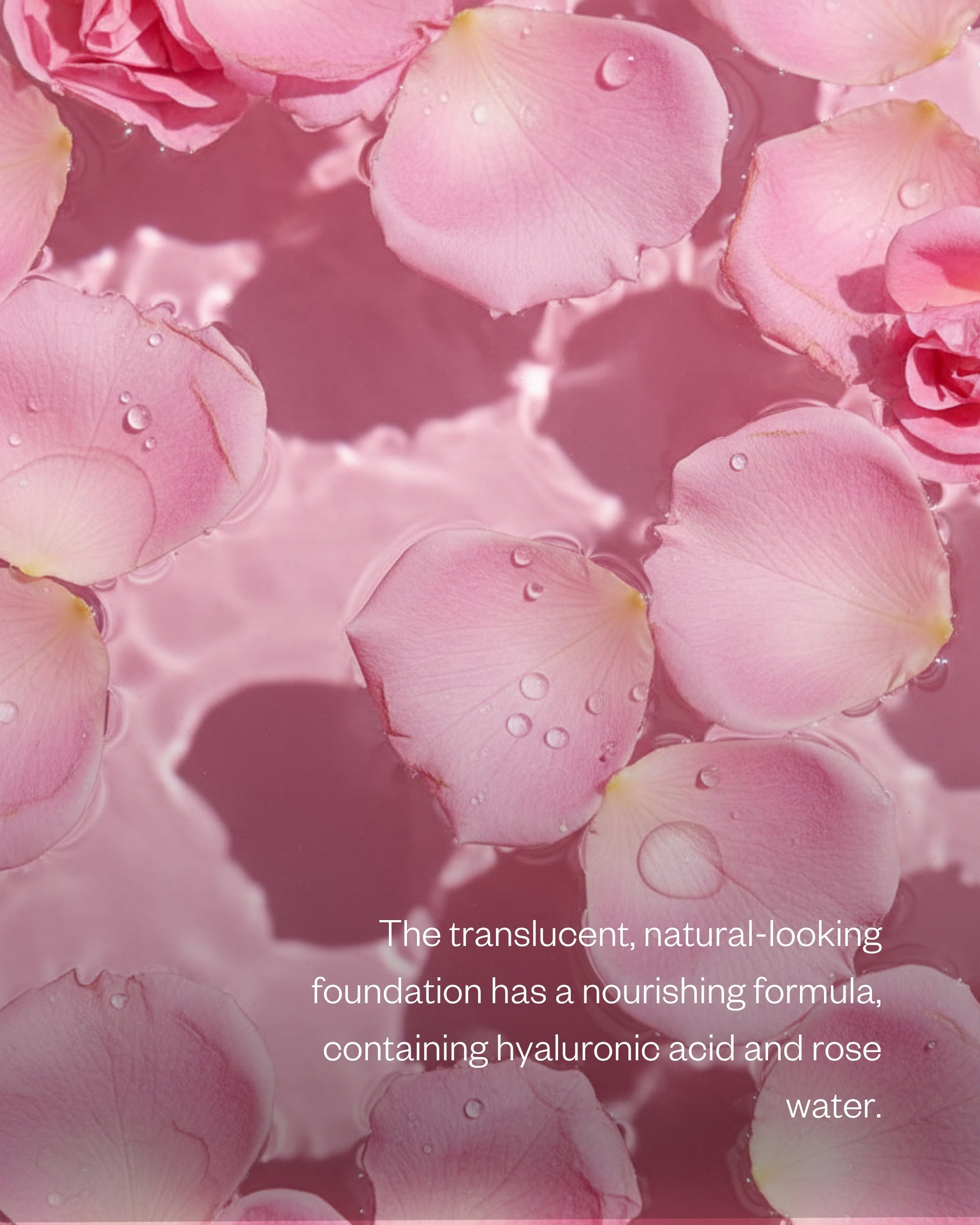 Moisturizing foundation with a natural and radiant finish. The nourishing, lightly smoothing formula contains hyaluronic acid and rose water. Excellent for aging skin. Apply with a brush or fingers and set with finishing powder if necessary.