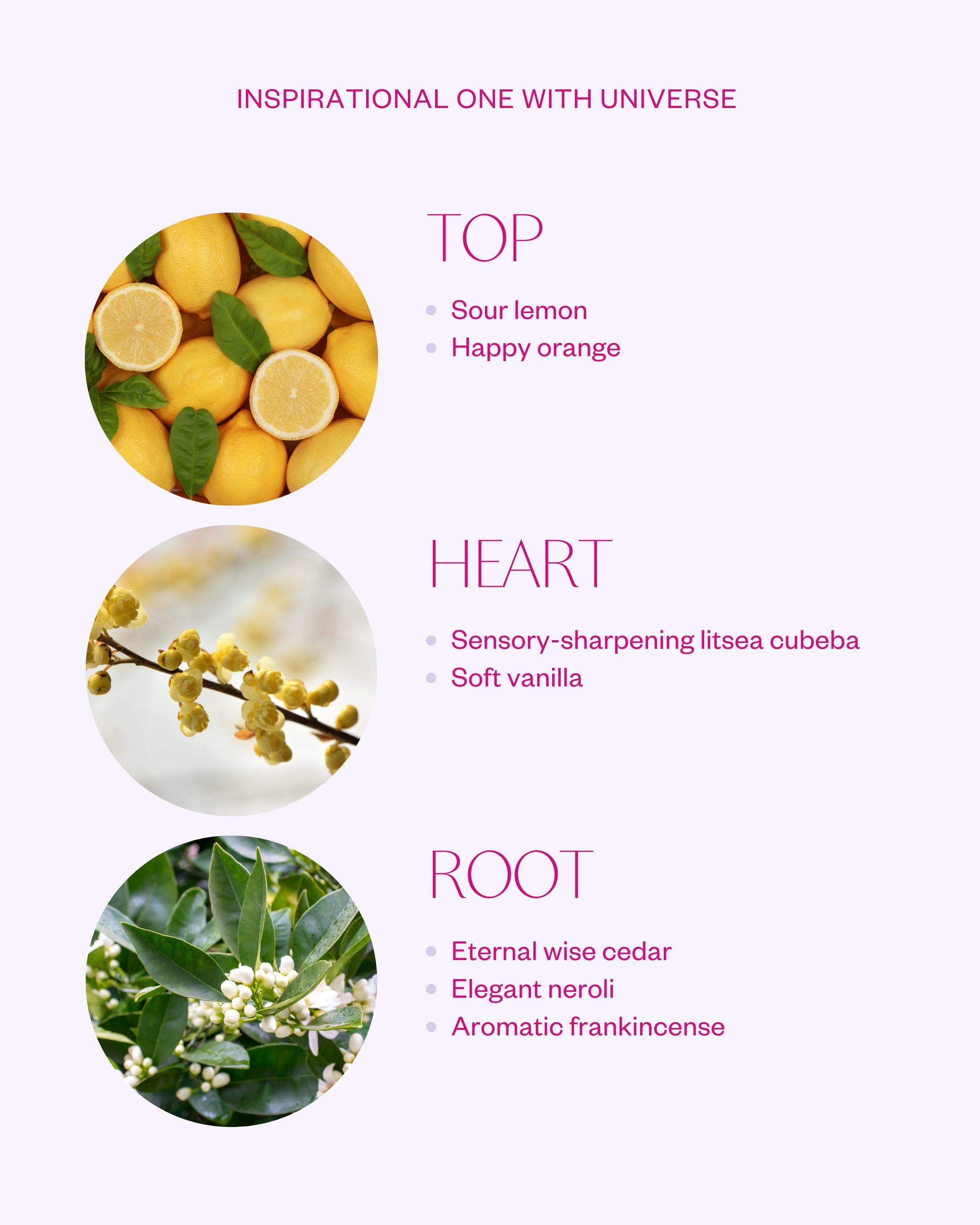 ONE WITH UNIVERSE products are suitable for opening and strengthening the crown chakra. This fragrance helps you on your path towards true knowledge. This fragrance dissipates negativity and empowers you to take control of your life.