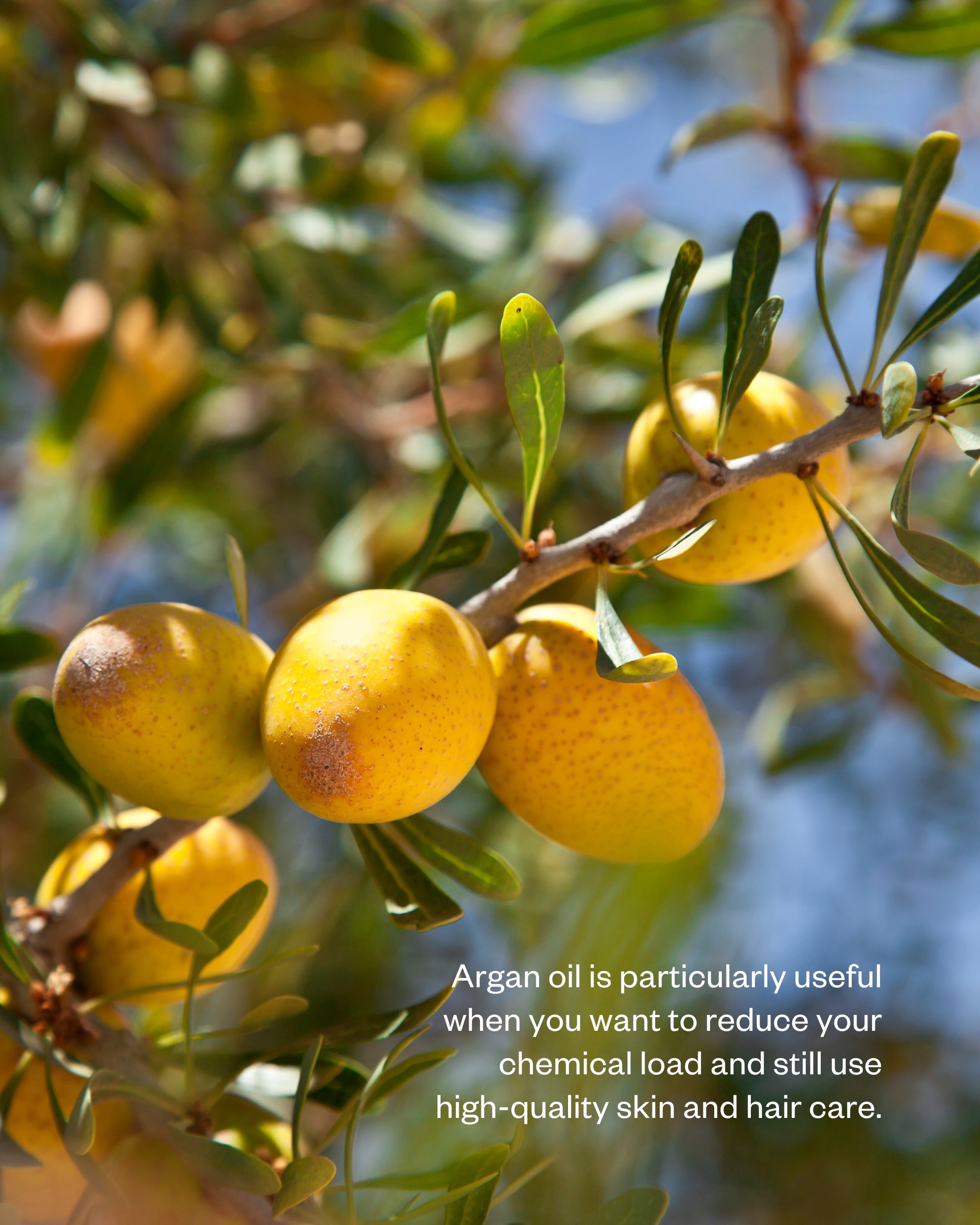 Argan oil is obtained from the nuts of the Moroccan argan tree. It contains a wealth of skin-nourishing fatty acids and Vitamin E. Despite its name, the oil has a light skin feel and is quickly absorbed, leaving the skin silky smooth.