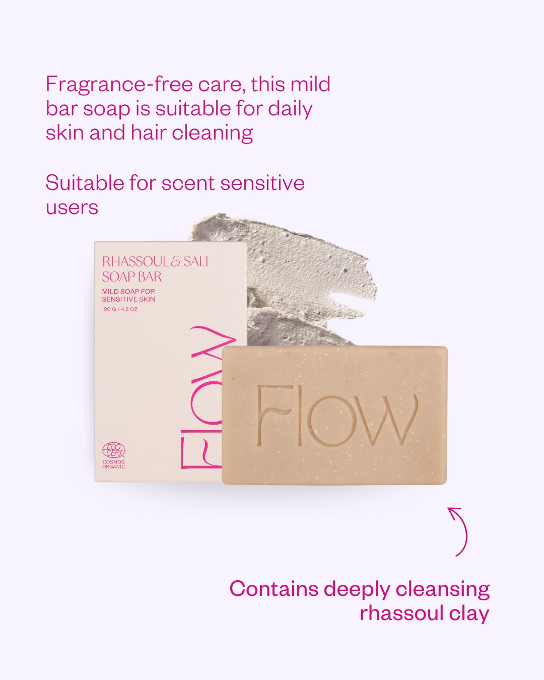 Flow Cosmetics' Rhassoul & Salt soap is specifically designed for sensitive skin and as a gentle cleansing product for various skin issues. It is popular for use on atopic skin, psoriasis, and flaky scalp. The soap is fragrance-free, making it suitable for those sensitive to scents. This gentle, vegan soap is also excellent for children and for washing the face.