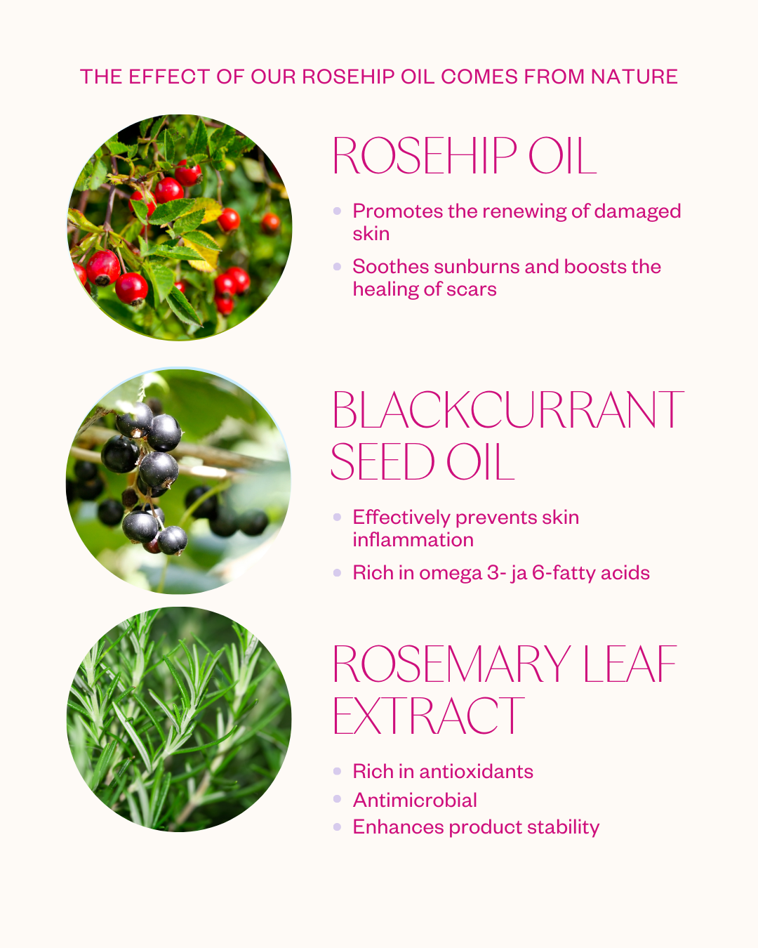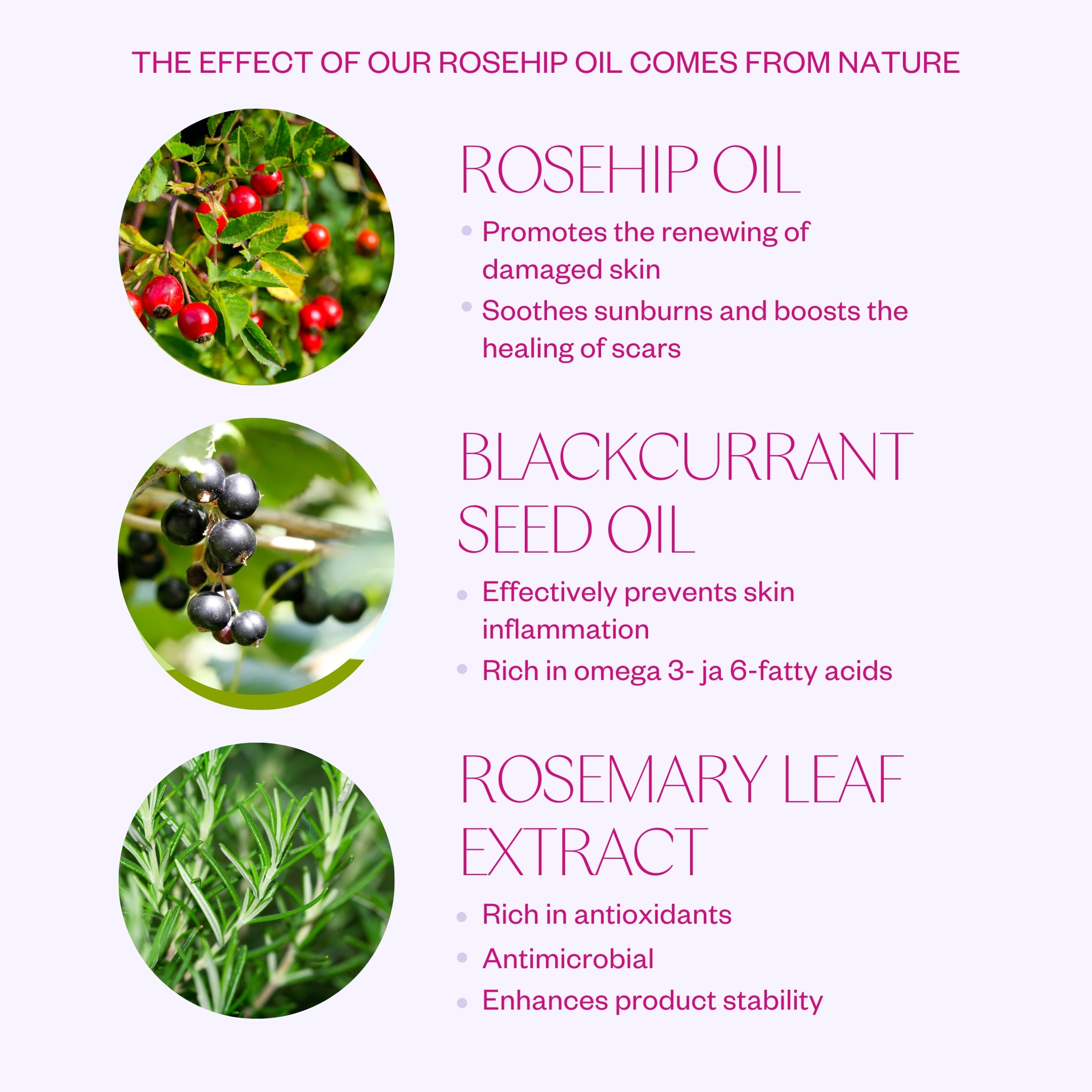 A soothing, rejuvenating powerhouse oil for imbalanced skin. The versatile fatty acid composition of rosehip oil, boosted with rosehip extract, supports and revitalizes the skin's functions. Suitable for all skin types, including sensitive, atopic, and couperose skin, as well as rosacea and acne.