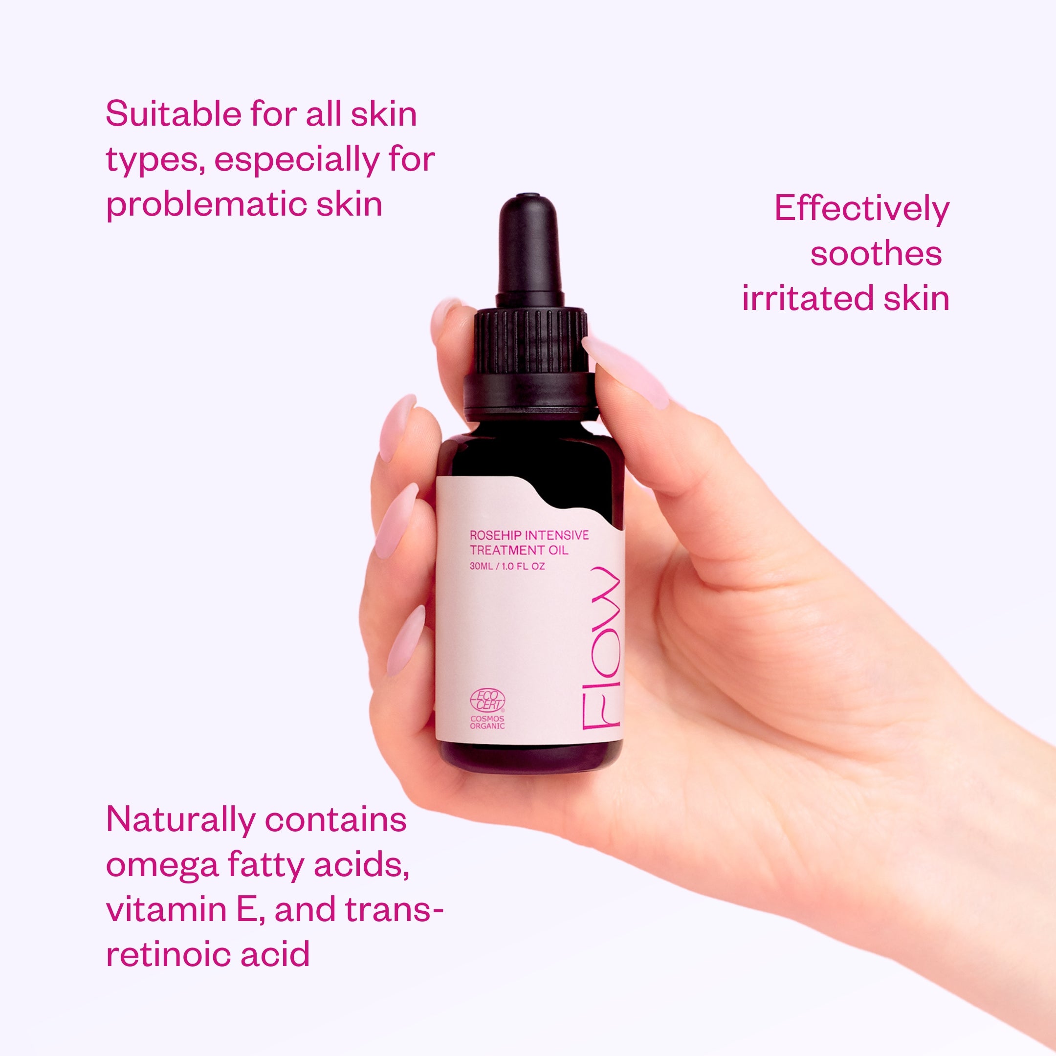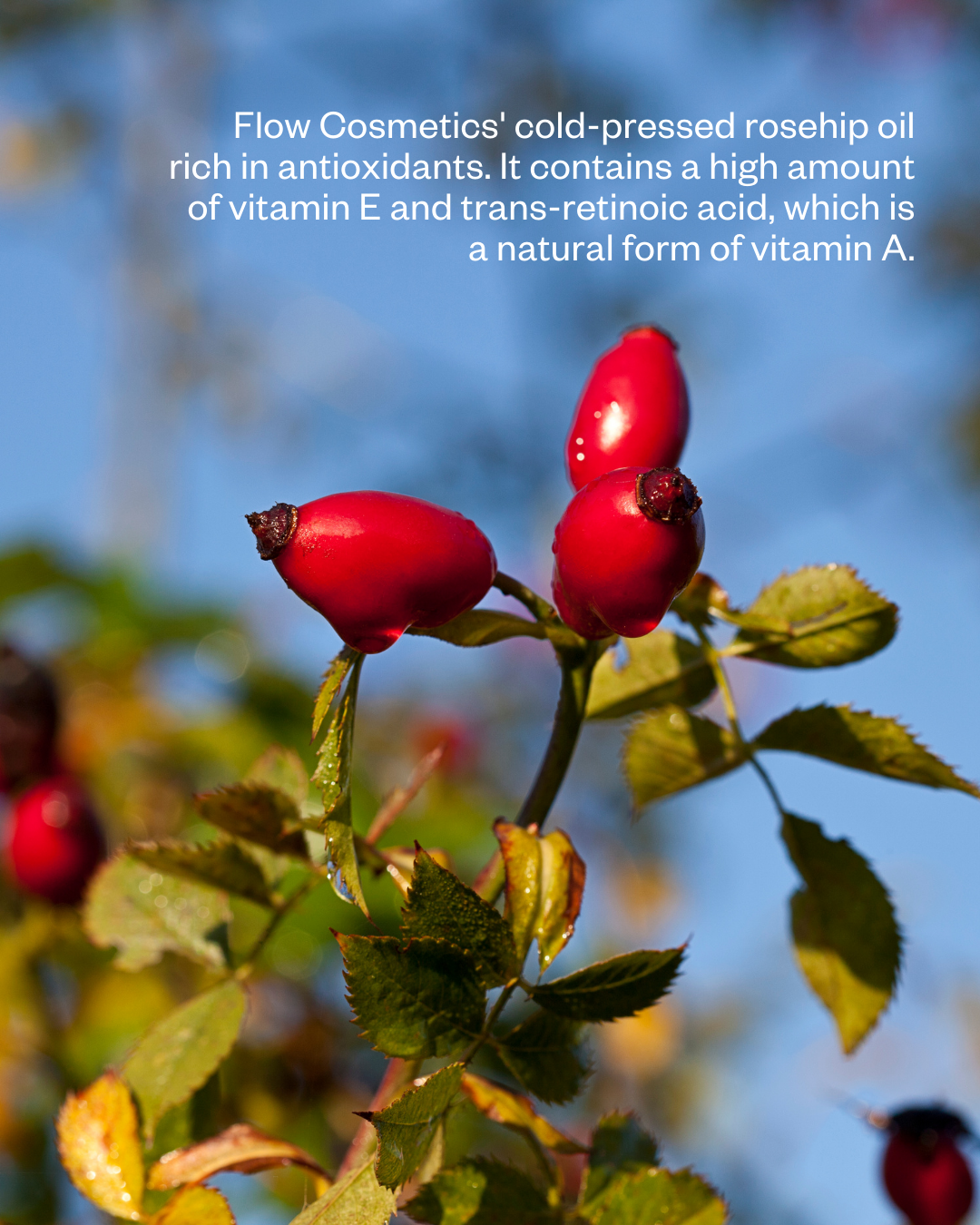 Flow Cosmetics' Rosehip Intensive Treatment Oil has a rich composition of essential omega fatty acids, antioxidant vitamin E, and skin-repairing trans-retinoic acid. The oil's intense effect is enhanced by the addition of rosehip extract, which is a concentrated formula of the beneficial nutrients found in rosehip oil. This oil has been used in beauty care throughout history, but recently its popularity has skyrocketed to cult status! The popularity of rosehip oil is based on its ability to renew the skin and reduce inflammation. This facial oil has a mild characteristic scent of rosehip oil.