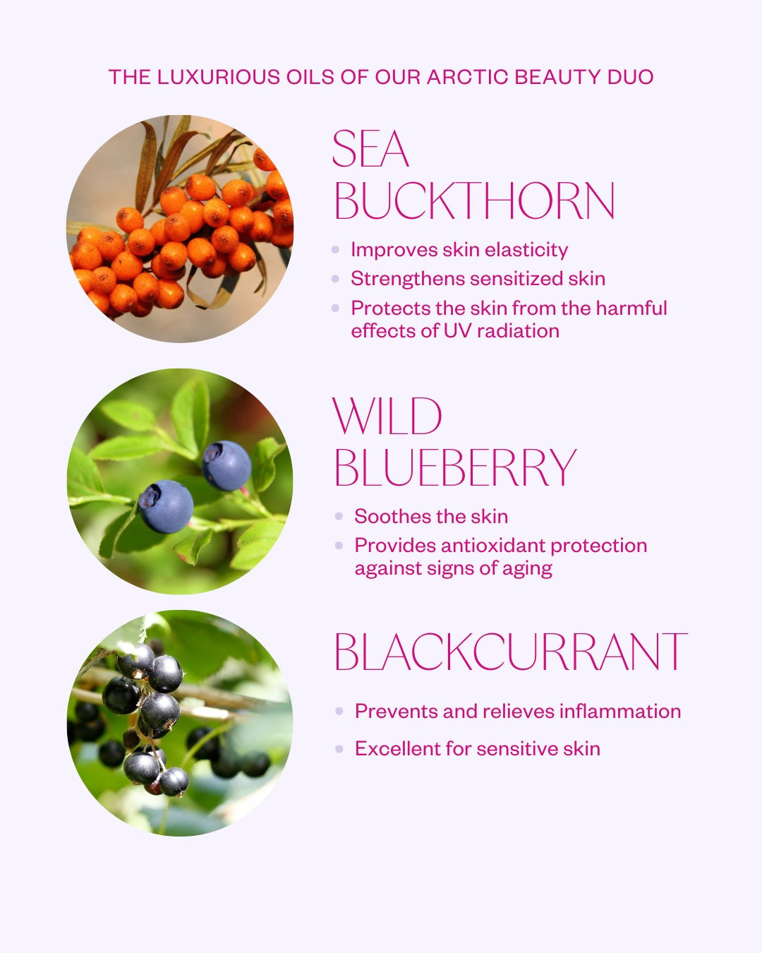 The Arctic Beauty Cream face cream and Arctic Beauty Oil face oil, which nourish dry, sensitive, and/or couperose skin, are full of the vitamins and antioxidants from northern berries, helping to effectively moisturize and protect the skin from signs of aging. Discover our favorite products easily in a travel-sized duo set or take them with you on your trip!