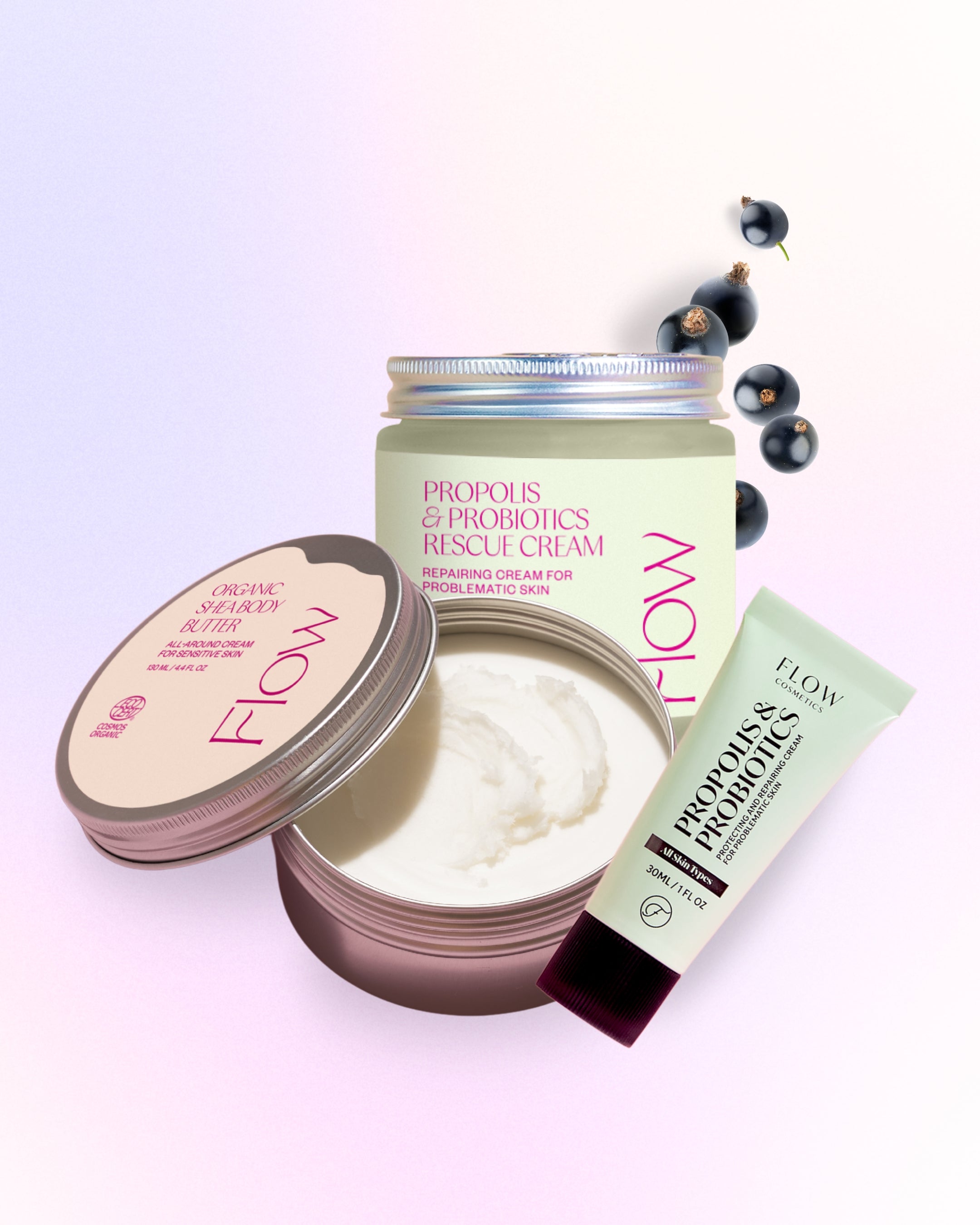 Täydellinen setti ärtyneen ihon tueksi sisältää Propolis & Probiotics -voiteen täysikokoisena 120ml sekä matkakokoisena 30ml ja lisäksi tuoksuttoman luomulaatuisen Shea Butter -vartalovoin 130ml.
